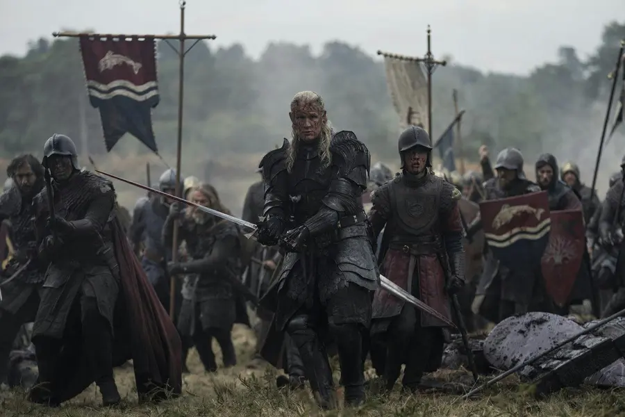 در اینجا ملکه رائنیرا تارگاریان (با بازی اِما دآرسی) لحظهای خصوصی را با تاج سنگیناش به اشتراک میگذارد و دیمون تارگاریان خونآشام (مت اسمیت) در حال قدمزدن بر روی میدان نبرد است، Dark Sister در دست دارد. بهعبارت دیگر، فصل سوم خانهٔ اژدهانیست که بهنظر میرسد داستانی ملایم پیشبرد نکند — بهویژه که نبرد خونین و بدنام «جنگ گولِت» در انتظار قسمت بعدی است. خبر تمدید فصل چهارم HOTD در طول ارائهای که امروز توسط رئیس هیئتمدیره و مدیرعامل HBO، کیسی بلوئس، برگزار شد، اعلام شد؛ و همانطور که پیشتر اشاره کردیم، هیچ تأییدی مبنی بر اینکه فصل چهارم آخرین فصل این برنامه باشد، وجود نداشت، اگرچه تولیدکننده ریَن کوندال (و سرپرست وستروس جورج آر.آر. مارتین) پیشتر اظهار کرده بود که نسبت به اینکه عدد چهار، عدد جادویی پیشدرآمد «بازی تاج و تخت» باشد، اطمینان دارد. بهگزارش Deadline، کوندال تصمیم نهایی درباره پایان داستان این سریال را زمانی میگیرد که نوشتن قسمت چهارم را تمام کند.