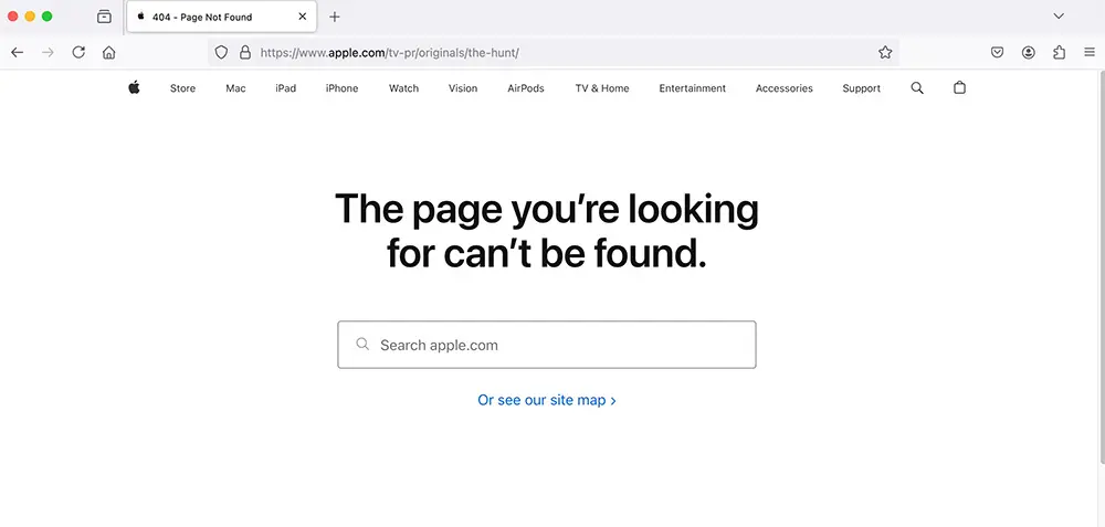 صفحهٔ خطای ۴۰۴ برای برنامه Apple TV+ به نام The Hunt AppleTV/اسکرینشات